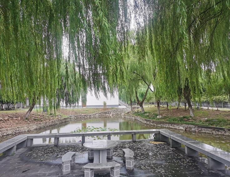 此外,在岸边平台增设石凳石桌,打造可供师生休憩、观景、交流的亲水空间,为师生提供舒适的户外学习与社交场所。目前,湖内水生植物生长良好,清澈的水面倒映着光启堂的建筑轮廓,曾经的淤塞水域已转变为景观区域,与即将启用的光启堂共同构成融合人文与自然的校园新场景。